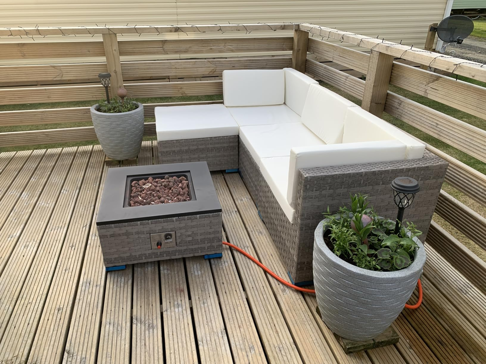 Arrived early which was great, in 3 big boxes. Took me about an hour to put together and didn’t need any extra tools. The set came with an extra coffee table as well as the fire pit. Comfy to sit on although similar to other reviews the cushions annoyingly slide about at the back and sides, so I’ll be buying Velcro to keep them put. Comes with a gas regulator and advises a 20lb gas bottle (uk), which I’ll be buying this week. Very happy with it as it’s also good value for money. I’d recommend paying attention to the measurements as the seat height may be too low for some people. Overall it’s a lovely product and I’m looking forward to using the fire pit table.