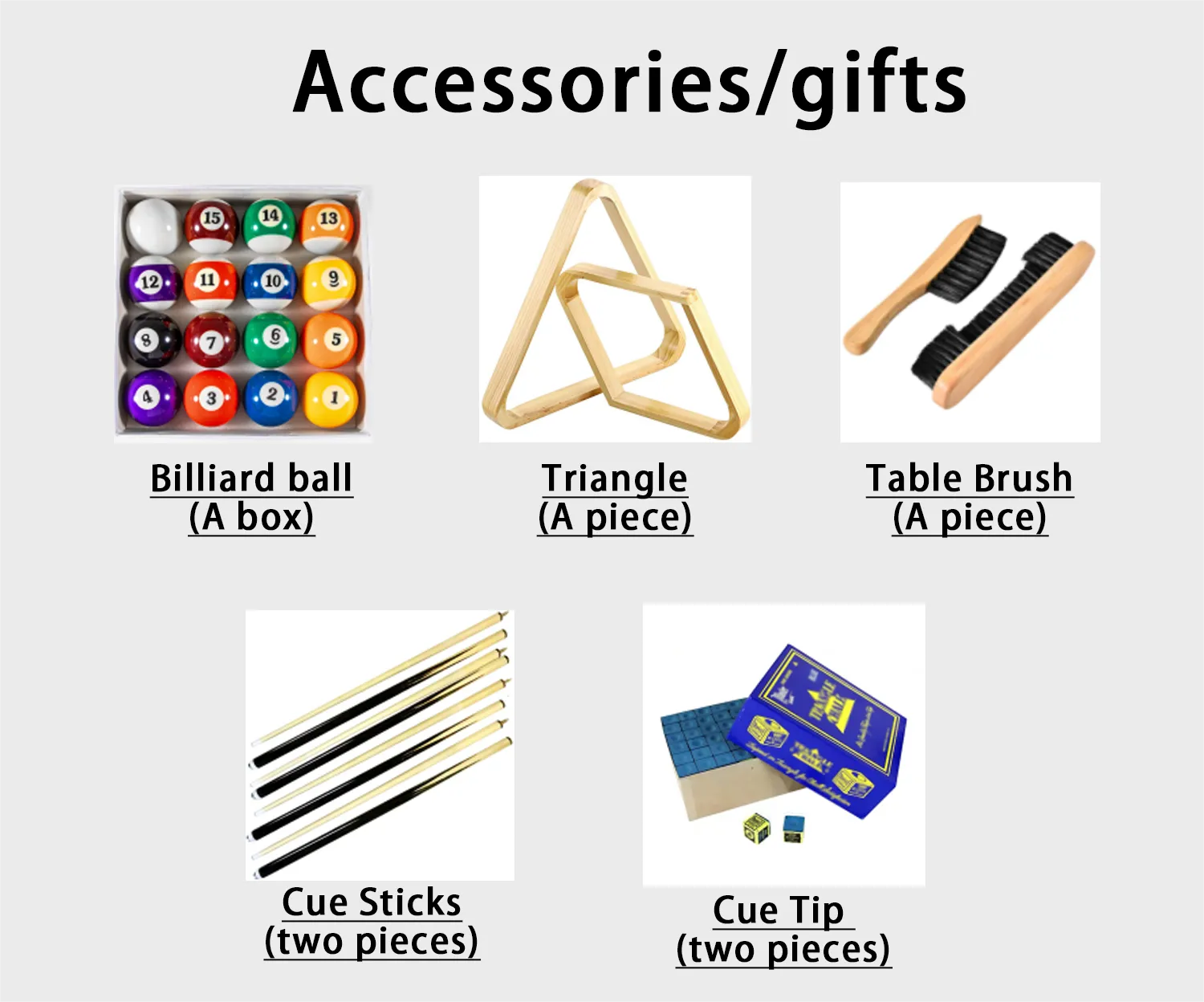 - Game equipment includes: 2 x 57 inch cues, triangles, chalk, brushes and billiard set. Assembled dimensions: 84. 5" L x 50" W x 31" H / 290 lbs. Playing field dimensions: